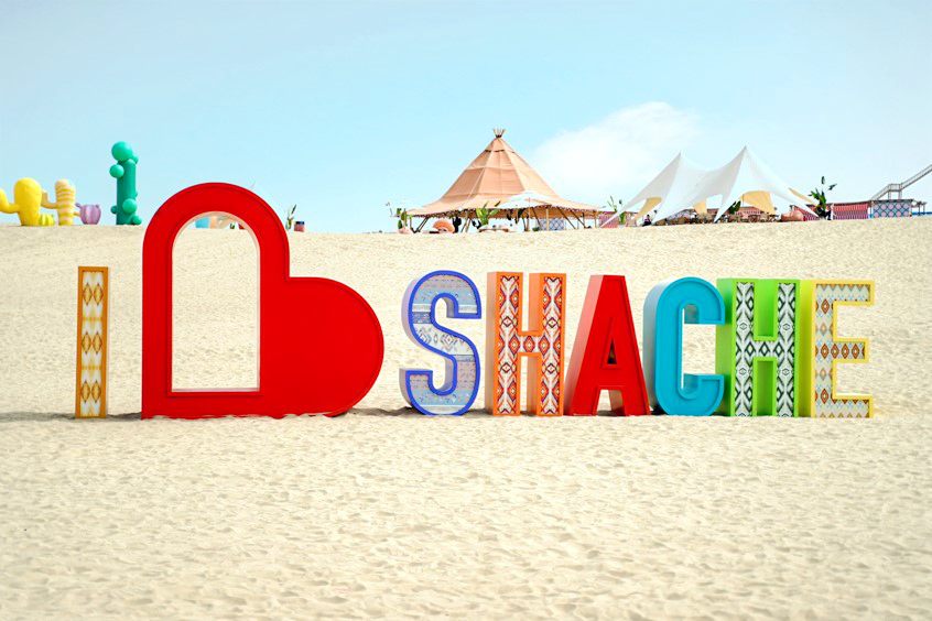 踏沙而来,因乐而聚。每天下午5点,在络绎不绝的人潮与欢呼中,沙漠音乐汇热力开场,现场人头攒动,热闹非凡。活动现场设置多个美陈装置,供游客任意选择。其中“I LOVE SHACHE”主题打卡点,饰以艾德莱斯纹样,尽显非物质文化遗产风采;彩色巨石组阵化作“多巴胺”调色盘,一眼望去瞬间唤醒满格元气;倾倒陶罐造型营造超现实空间观感,引发游客连连赞叹;童趣乐园内置缤纷宝藏,打造沉浸式亲子体验空间;日晷光影随天光变换景致,一圈圈勾勒出沙海“年轮”。