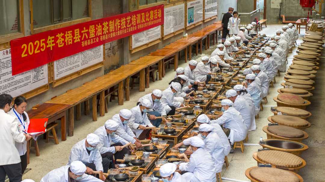 11月4日,广西壮族自治区梧州市苍梧县沁怡六堡茶工匠学校,参赛者在进行六堡油茶制作技艺比赛。
