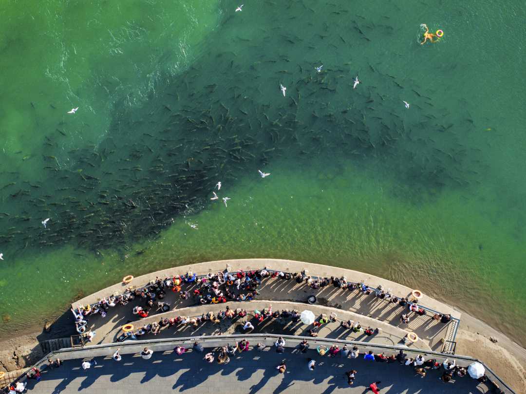 12月7日,位于四川省宜宾市翠屏区合江门的长江零公里处,空中翱翔的红嘴鸥和成群的野生鱼吸引市民前来观赏。