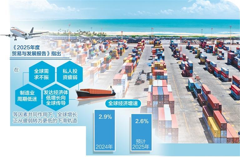日前,联合国贸易和发展会议(贸发会议)发布《2025年度贸易与发展报告》指出,2024年至2025年,全球经济处于“脆弱韧性”状态,具体表现为表面稳定,但结构疲弱且风险积聚,看似未出现全面衰退,但恢复力量弱、质量差、易被外部冲击影响。预计2025年全球经济增速将放缓至2.6%,低于2024年的2.9%。