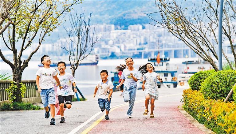 10月12日,小朋友在云阳县环湖绿道游玩。该县将库岸整治与城市文化、自然景观有机融合,建成33公里的国家4A级旅游景区环湖绿道,为市民娱乐休闲提供新场所。