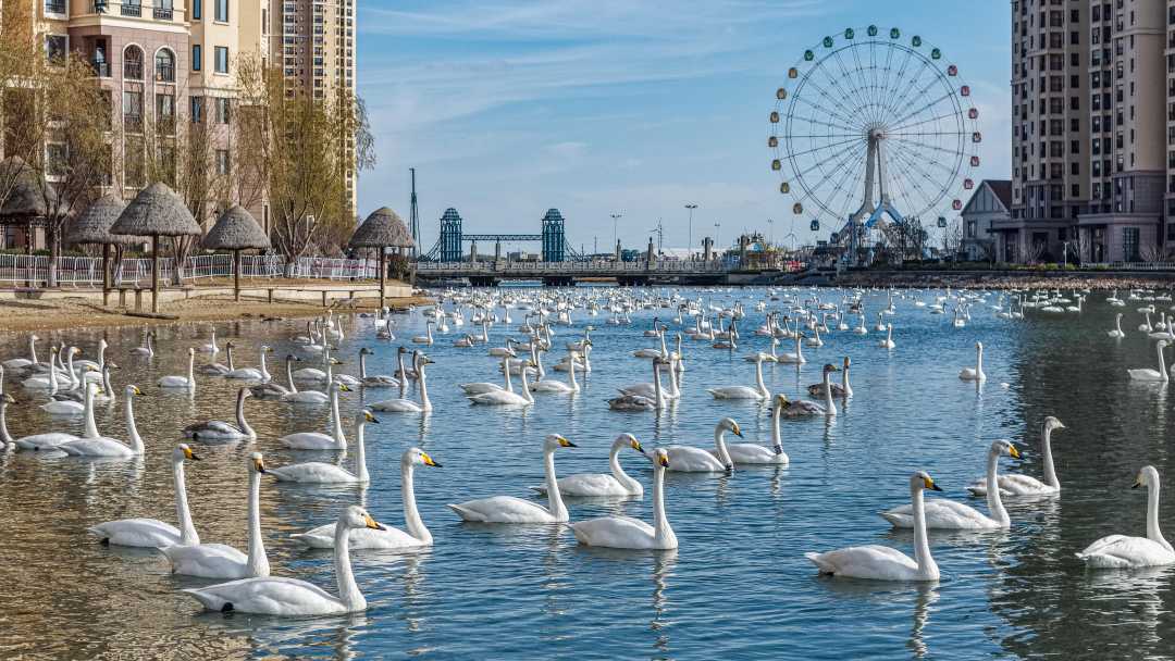 12月8日,山东省荣成市那香海天鹅湖水域,成群结队的大天鹅在湖面上游弋、觅食、栖息。目前,飞抵荣成越冬的大天鹅总数已近万只,迎来大天鹅最佳观赏季。
