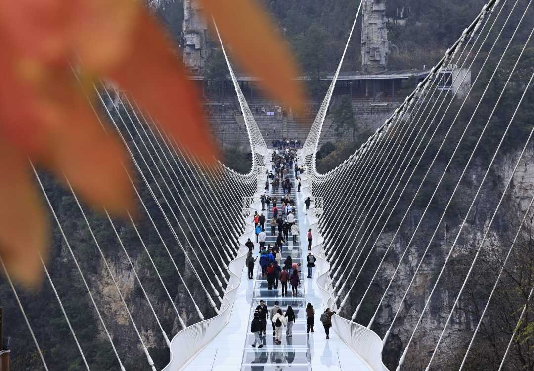 12月7日,游客在湖南张家界市大峡谷风景区体验高空玻璃桥。进入11月以来,张家界凭借独特的冬季景观和舒适的气候条件,旅游热度持续不减。目前,公园每天入园游客数量仍稳定在1万人以上。