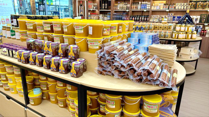 新疆塔城巴克图中哈边民互市丝路文化商品城展示销售的商品。殷悦摄