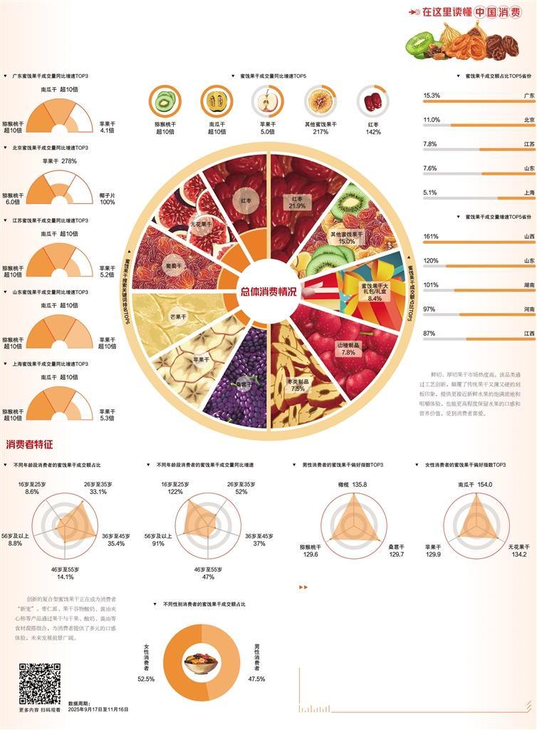 蜜饯果干行业总体规模不断扩大的同时,一些细分品类也呈现出快速增长。近期,猕猴桃干、南瓜干、苹果干等产品在多个省份的成交量实现同比数倍增长。尽管面临供应链效率优化、同质化竞争等挑战,但在消费升级的趋势下,蜜饯果干产业正稳步走向一个更健康、更富情绪价值也更可持续的未来。(本文来源:经济日报 作者:刘 莉)