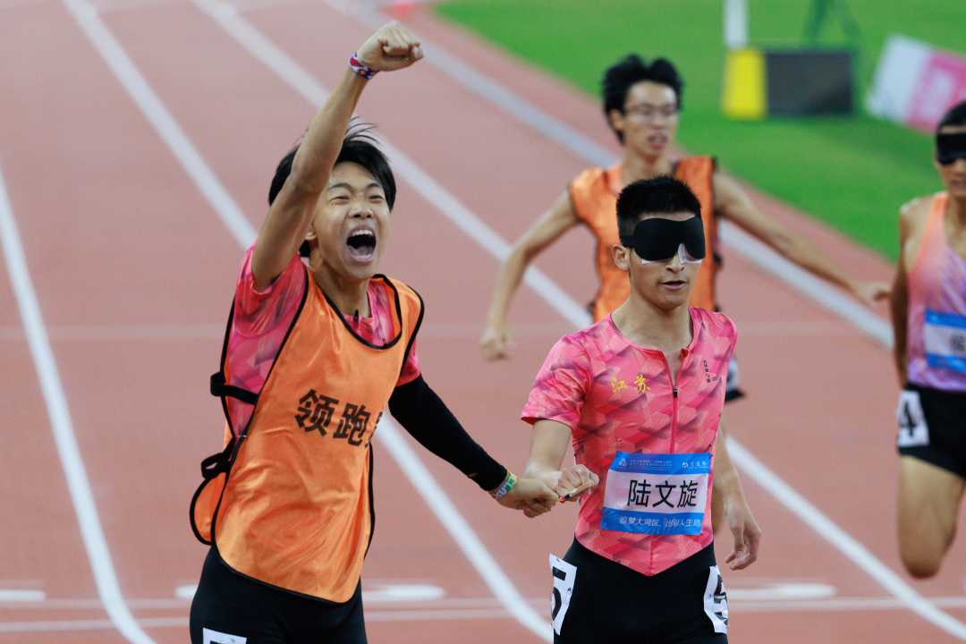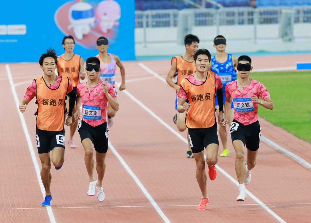 12月10日,全国残特奥会田径男子1500米T11决赛在广州举行,运动员在做最后的冲刺。