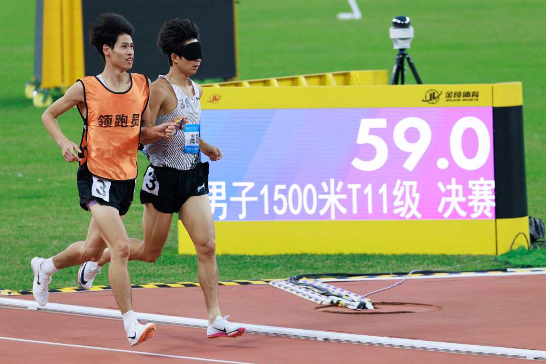 T11级,表示运动员视力近乎完全受损,比赛全程,领跑员通过一根引导绳为运动员指引节奏、方向。