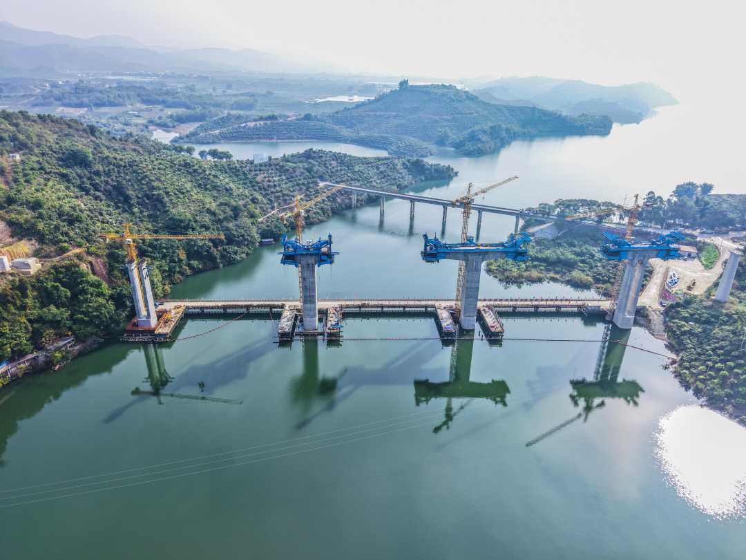 12月9日,广西百色市右江区那蒙澄碧河特大桥加紧施工。该大桥是黄百铁路接入南昆铁路永乐至百色间增建二线的关键工程之一。据了解,黄百铁路全长约315公里,是西部陆海新通道标志性工程。