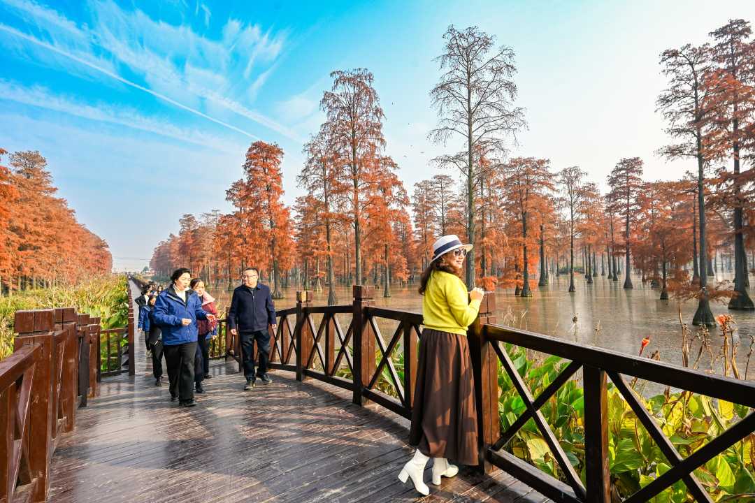 12月11日,湖北省武汉市新洲区涨渡湖湿地森林公园色彩斑斓,吸引许多游客前来拍照打卡。据了解,涨渡湖湿地共有2.4万株杉树,游客沿木质栈道穿行于水杉林间,感受“树在水中长,鸟在林中飞”的美景。