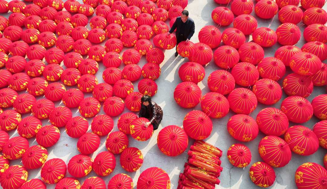 12月10日,山西省运城市稷山县稷峰镇杨赵村俊刚灯笼厂工人在晾晒红灯笼。杨赵村有100多年制作灯笼的历史,灯笼加工已成为当地的主导产业。