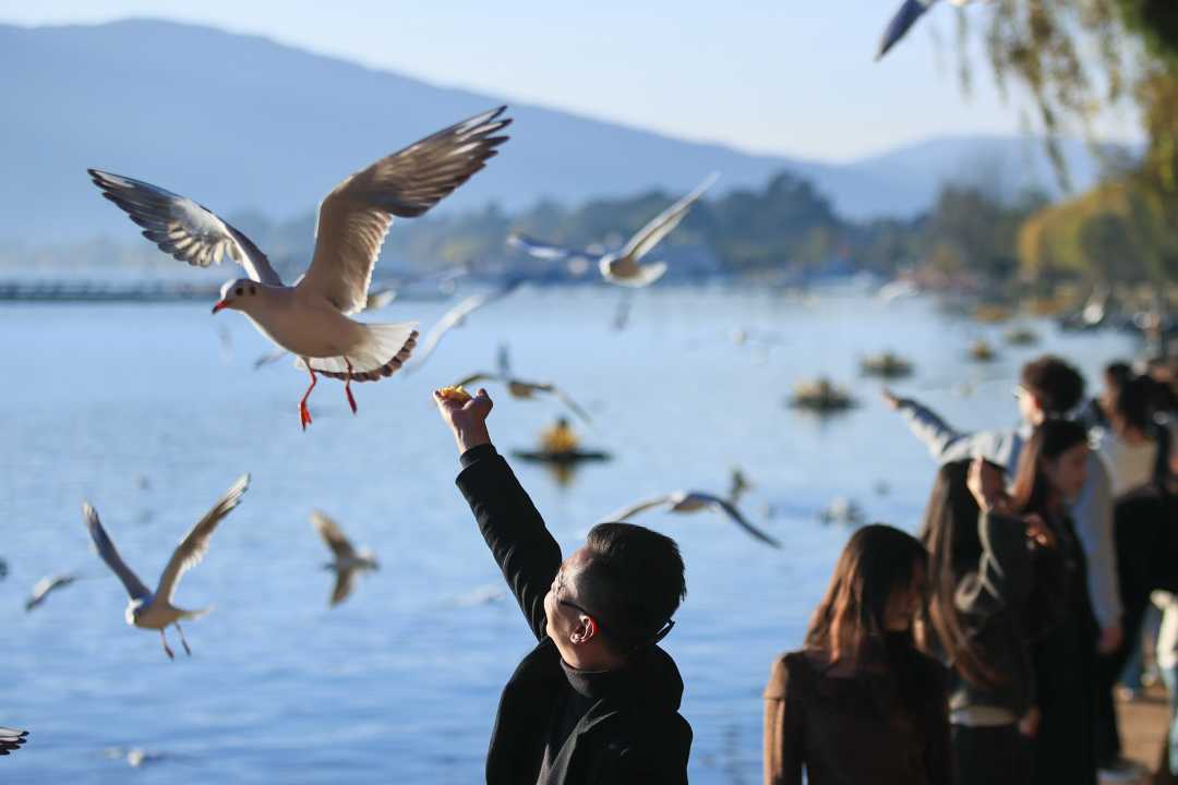 12月11日,云南省昆明市滇池畔的海洪湿地公园,大批红嘴鸥翩跹飞抵越冬,灵动的鸥群为春城冬日添上生机亮色,吸引众多市民游客前来赴约。
