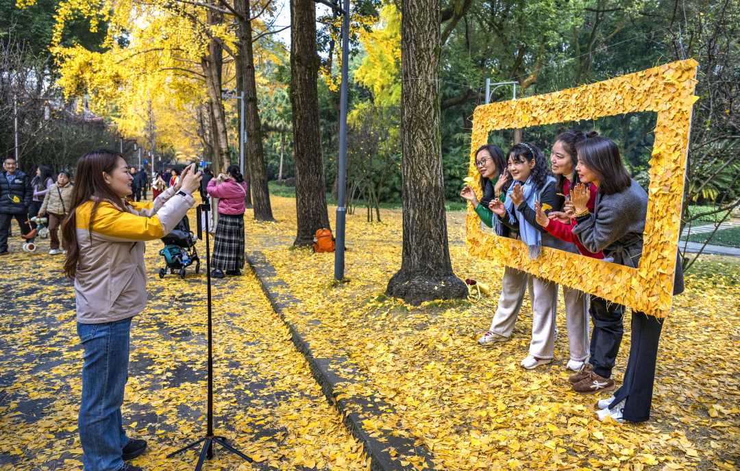 12月11日,游人在四川省成都市人民公园内的“银杏大道”上赏景拍照。初冬时节,人民公园的银杏进入最佳观赏期,游客纷纷前来观赏打卡。