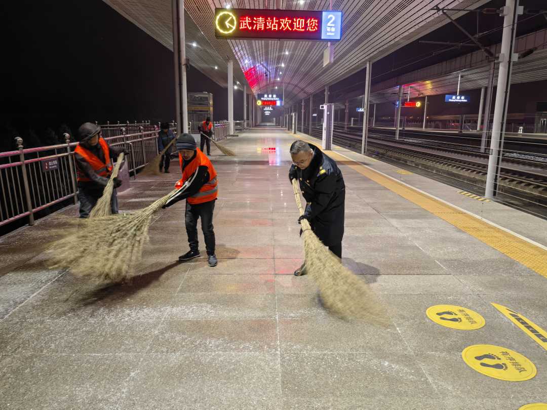铁路天津站辖区包含天津站、天津西站、天津南站、天津北站、武清站、滨海站、滨海西站、滨海北站、军粮城北站、北辰站、胜芳站等14个车站,相关车站迅速召开应急专题会议,研判雪情对运输生产的影响,研究部署应急处置措施。各级干部职工迅速到岗到位,严格落实24小时值班制度。天津站领导班子成员分片包保,重点加强对行车组织、旅客乘降及扫雪打冰等关键环节的现场监控与指挥,确保应急指令传递畅通、执行有力。凌晨时分,由车站职工组成的23支除雪小分队迅速集结,拿着除雪工具奔赴各站台、进出站口及广场区域,争分夺秒地清理积雪和积冰。