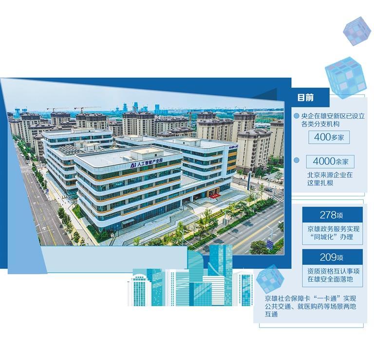 打造疏解北京非首都功能集中承载地,是雄安新区一项重要任务。伴随疏解项目落地,雄安服务疏解、配套疏解、支撑疏解能力不断提升,目前央企在雄安新区已设立各类分支机构400多家,4000余家北京来源企业在这里扎根创业。中央一揽子特殊支持政策落地见效,278项京雄“同城化”政务服务应用场景全面落地,疏解人员创业条件、居住条件、福利待遇不低于留京水平。