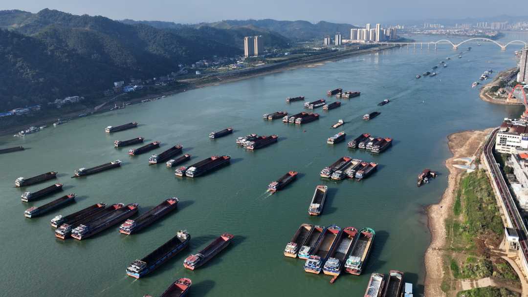 12月14日,货船在西江主航道广西梧州市城区河段穿梭,一派繁忙景象。