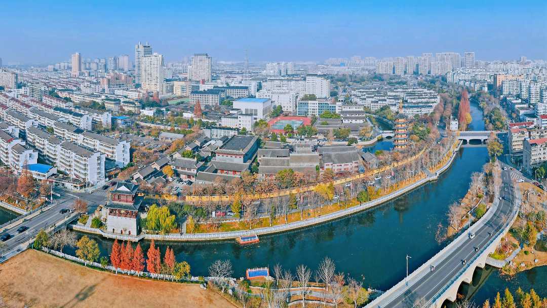 12月14日,江苏省如皋市,环绕主城区的河水与古今建筑相映成景,在冬阳下呈现出一幅美丽画卷。