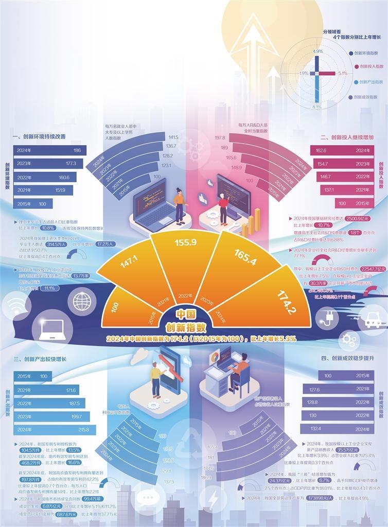 国家统计局数据显示,2024年中国创新指数为174.2(以2015年为100),比上年增长5.3%。我国科技创新能力持续提升,创新产出较快增长,发展新动能不断壮大,为经济高质量发展提供有力支撑。
