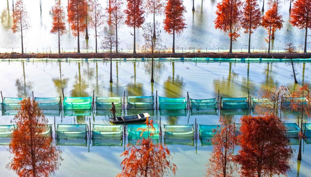 12月14日,江苏省宿迁市泗洪县临淮镇城头社区,蟹农在蟹塘进行日常管护。
