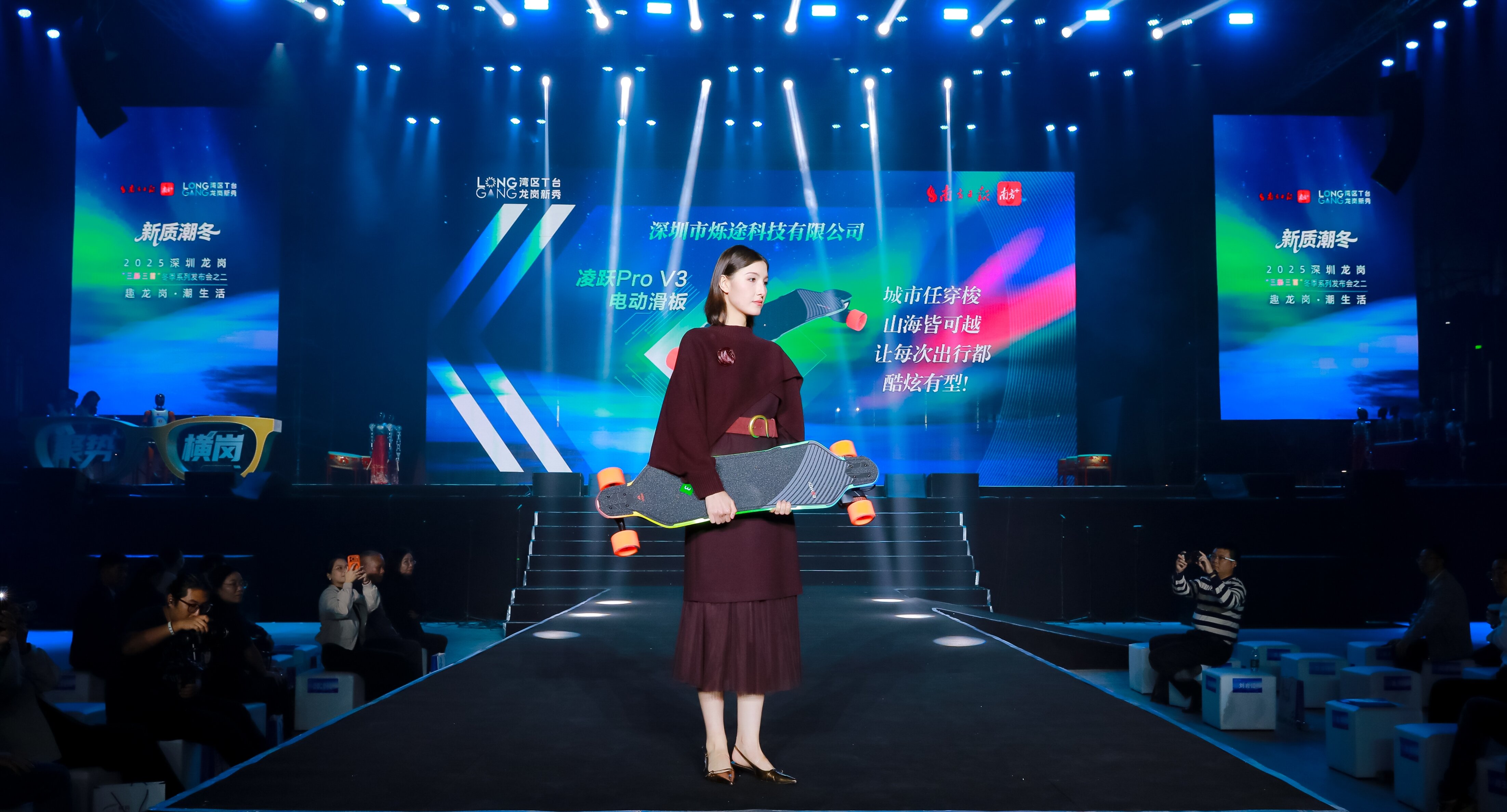 在“AI 潮看我”主题T台秀环节,深圳市硅芯创新信息科技有限公司携三款特色AI潮玩亮相,其中“横岗 Ai 宝”内置横岗专属 “记忆芯片”,肩负地方文化传播使命;深圳市烁途科技有限公司带来的电动滑板不止于代步功能,更以操控乐趣与酷炫造型,让城市穿梭成为彰显态度与风格的生活表达。