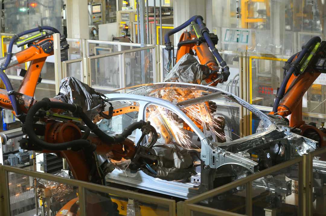 12月16日,位于山东省青岛市即墨区的一汽—大众青岛基地焊装车间,机器人进行焊接作业。
