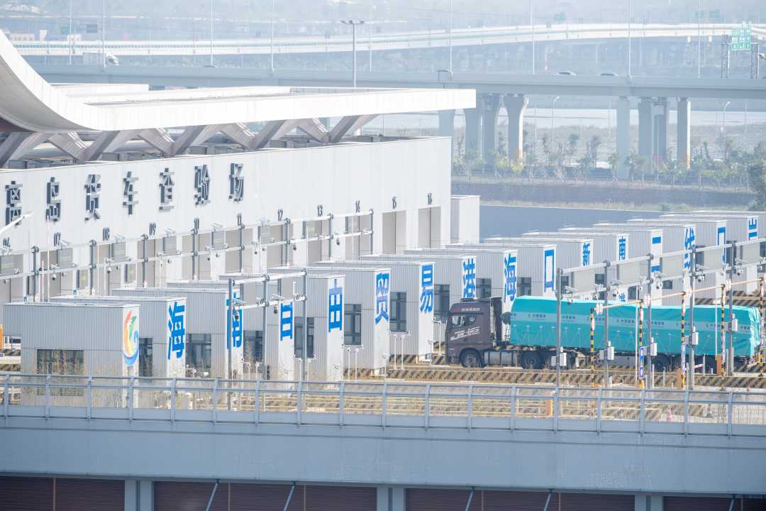 12月18日,海南自贸港正式启动全岛封关,在海口新海港和南港“二线口岸”(货运)集中查验场,第一批货物正在通过海关监管通道。
