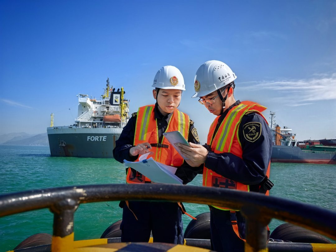 黄埔老港海关关员在大屿山锚地对验收后首单出口业务实施监管。张海龙 摄
