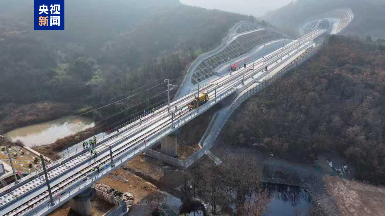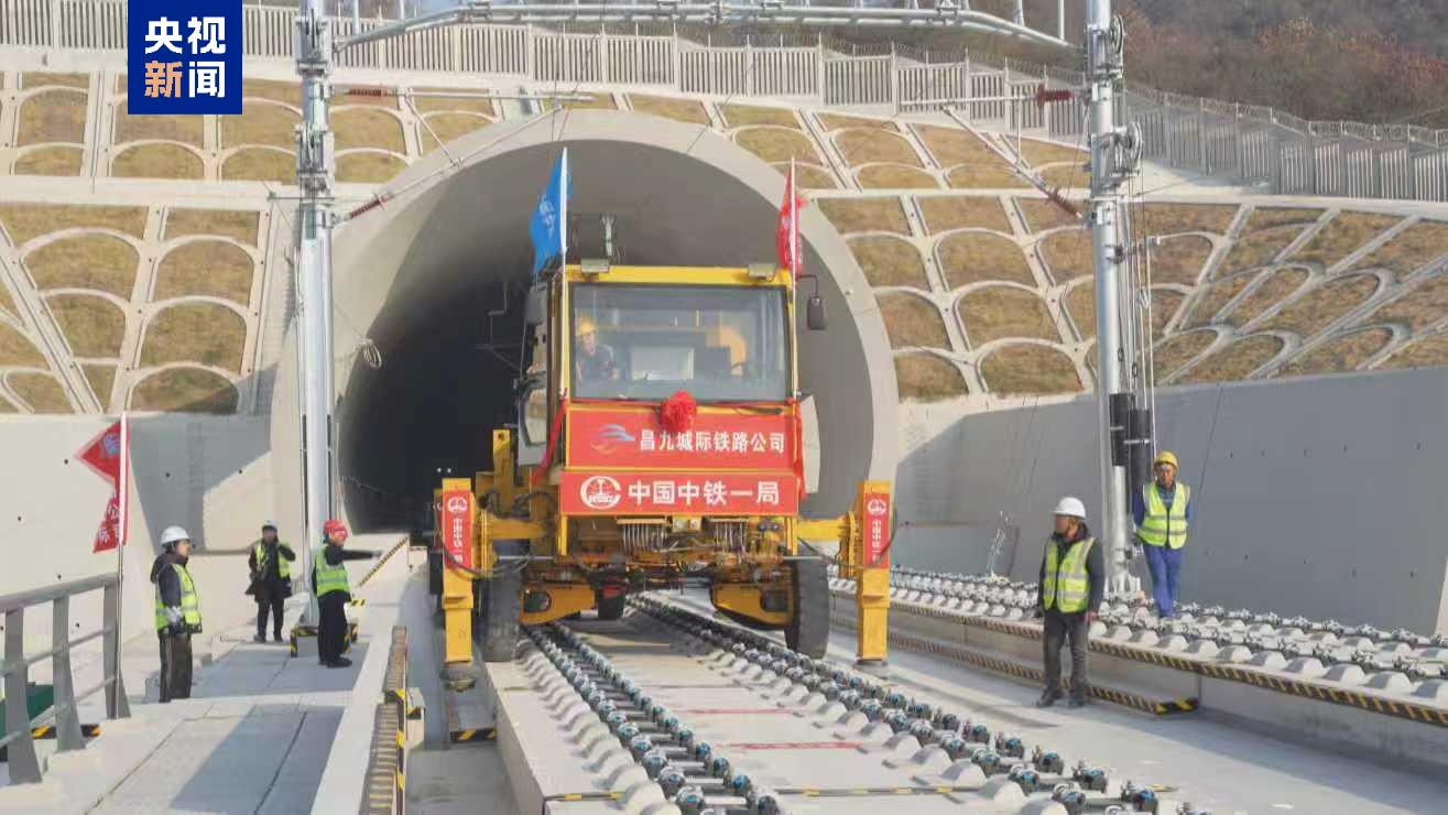 12月19日,在江西九江柴桑区的昌九高铁尖山岭隧道铺轨施工现场,随着铺轨车将第一对500米长钢轨平稳铺设到位,昌九高铁正式进入全线铺轨阶段。