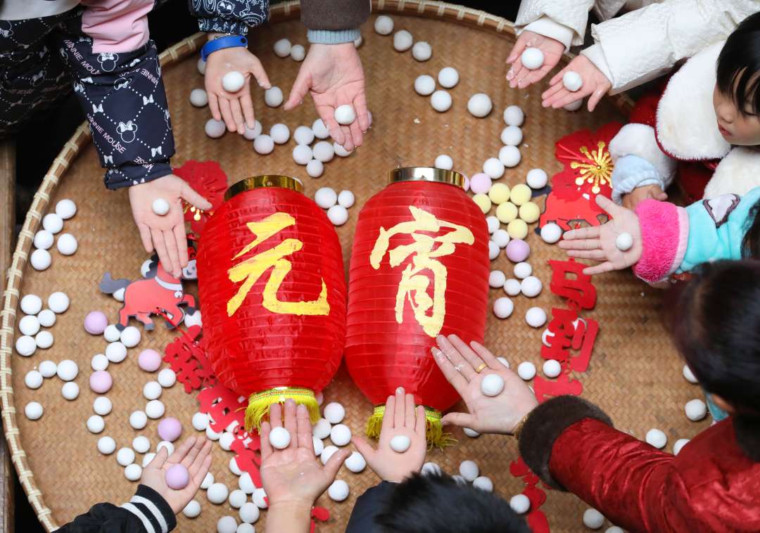 3月3日,浙江省杭州市天目山镇交口村文化礼堂,村民和志愿者一起包汤圆,欢度元宵佳节