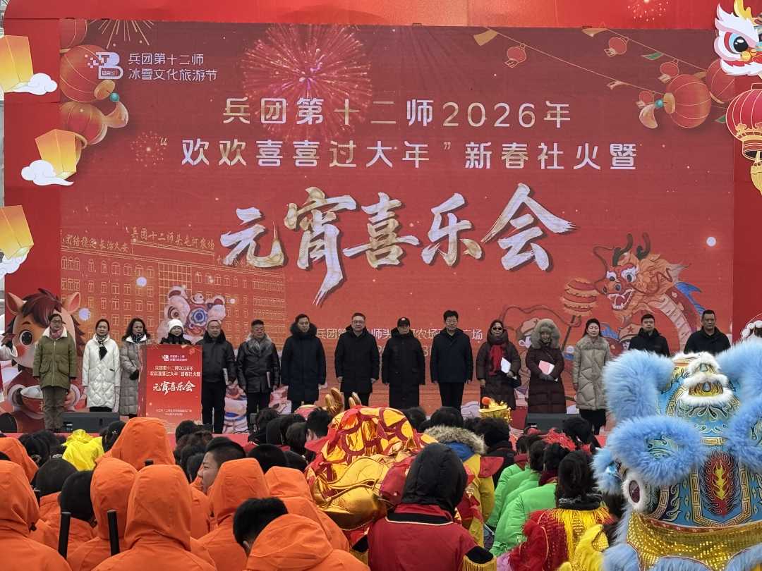 3月3日,新疆生产建设兵团第十二师2026年“欢欢喜喜过大年”新春社火暨元宵喜乐会活动在头屯河农场融合主题文化广场举行。现场1500余名社火演员同台献艺,营造了“文化+科技+民俗”的节庆氛围。