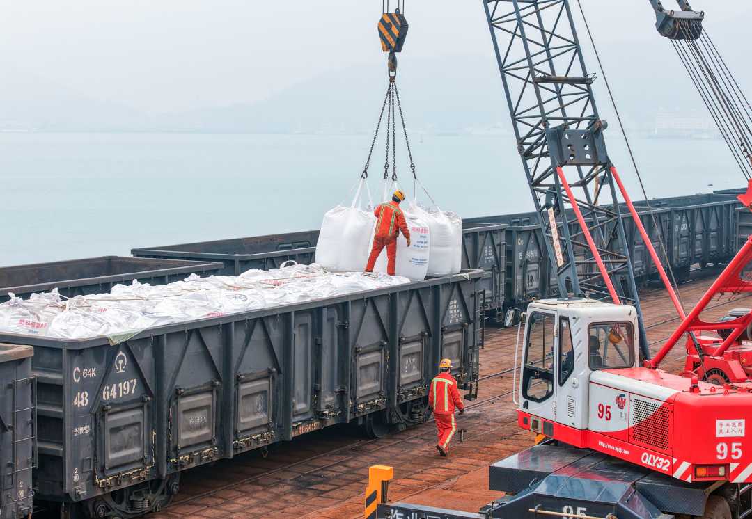 3月4日,工人在江苏连云港港东方港务分公司码头装运化肥。