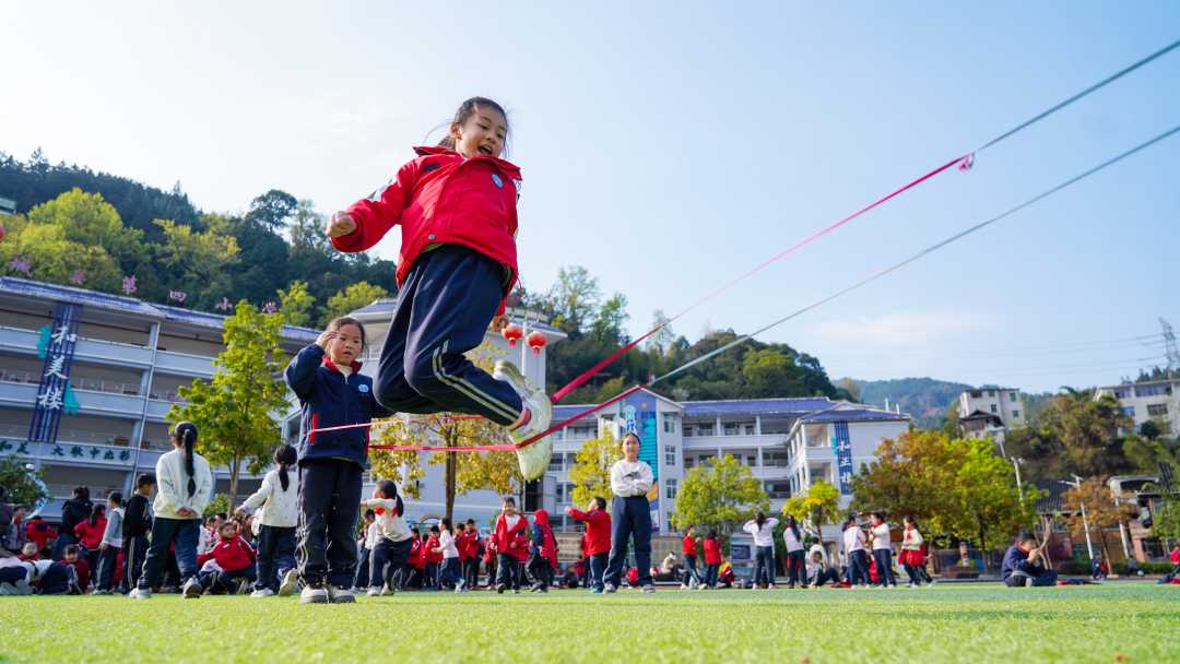 3月4日,贵州省从江县城关第四小学的操场上活力满满,学生在课间跳皮筋。