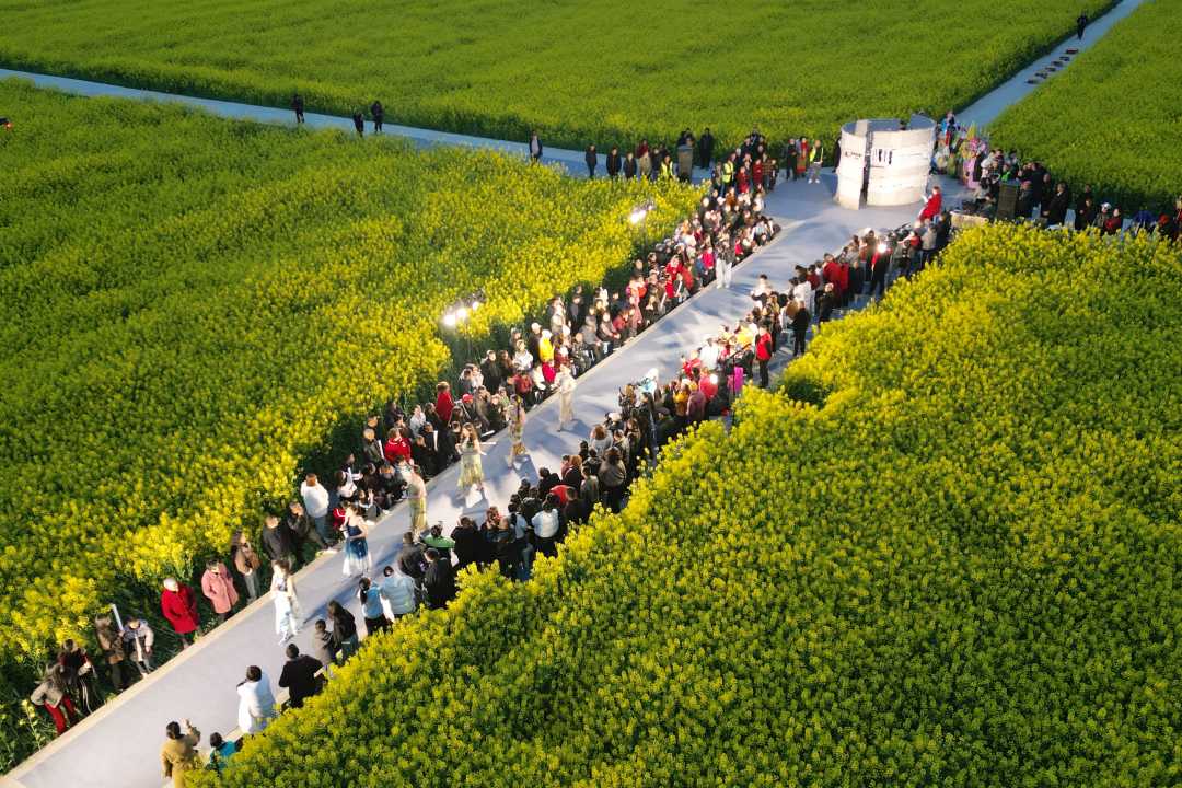 3月7日,四川省德阳市旌阳区德新镇长江村“菜花纪”春日艺术生活季现场,油菜花田旁的道路变身T台,村民与专业模特同台走秀