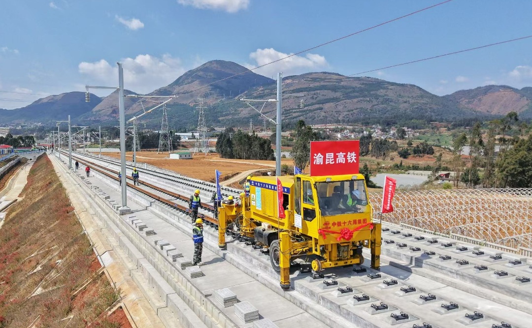 据介绍,渝昆高铁线路穿越云贵高原乌蒙山腹地,地质地貌复杂,桥隧比高达87.4%,超10公里的长大隧道达10座。此次铺轨施工任务,涵盖上下行钢轨铺设846公里、无砟轨道道岔50组、无砟轨道钢轨伸缩调节器16组等重要工程。中铁十六局渝昆高铁铺轨施工技术负责人张延介绍,针对渝昆高铁集复杂地质、长大隧道群、30‰连续长大坡道于一体等特点,施工单位研发应用了长大坡道铺轨、制动与精调成套技术,并配备先进工装设备与智能监测系统,确保铺轨安全和精度。