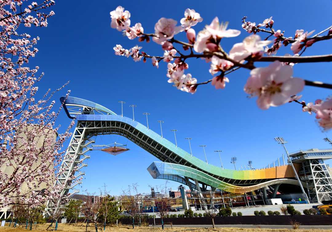 3月18日,北京首钢园滑雪大跳台与绽放的山桃花相映成景,刚柔并济的独特景致吸引市民游客前来打卡。