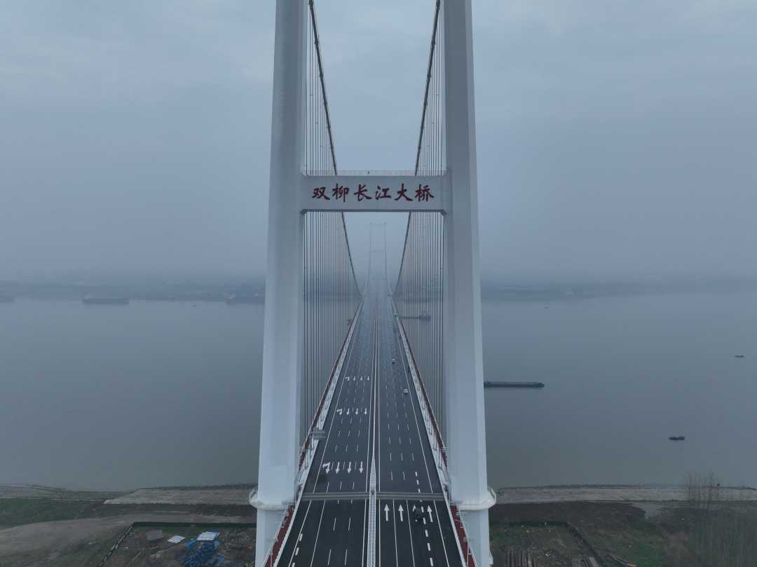 双柳长江大桥是国家高速路网武汉都市圈环线的重要组成部分和湖北省“十四五”规划中的重点建设项目,工程全长35.043公里,设计速度120公里/小时。主桥为1430米双塔单跨钢箱梁悬索桥一跨过江,凭借“跨度大、桥面宽、主塔高、材料新”四大特点,成为长江流域跨江标杆工程,处于国内同类型桥梁前列。从首根桩基开钻到大桥南北合龙,仅用时2年10个月,创造湖北长江大桥建设新纪录。