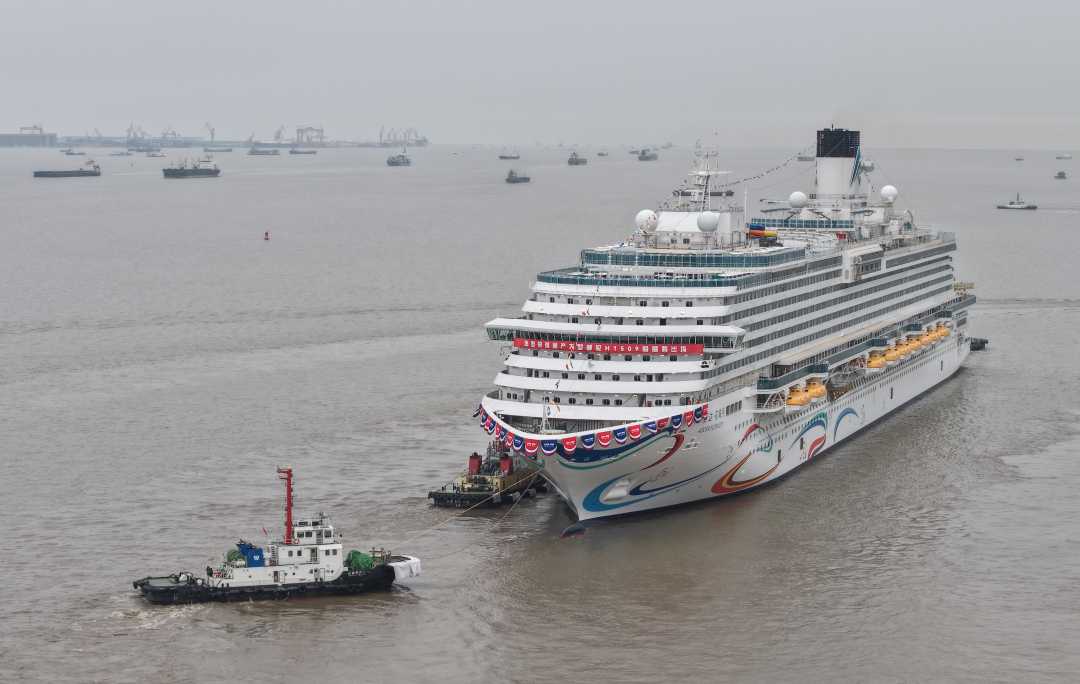 3月20日,国产大型邮轮“爱达·花城号”号在上海外高桥船厂成功驶离船坞,准备靠泊船厂的码头。