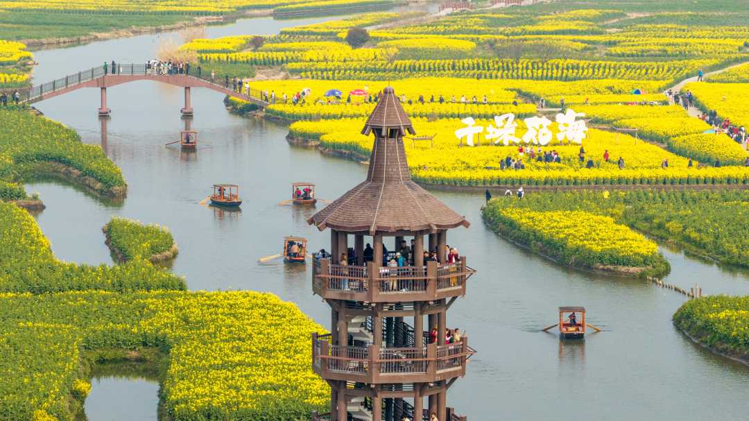 3月20日,游客在江苏兴化市千垛景区赏花游玩。