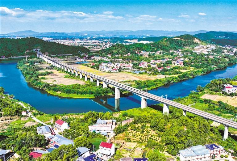3月12日,高铁驶过江西省萍乡市老关镇仁村村,蜿蜒的萍水河与田园民居相映成景。我国已累计建成幸福河湖5500多条,打造一大批高质量滨水空间。姚雨婷摄(中经视觉)