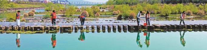 3月18日,浙江省台州市仙居县白塔镇,志愿者在永安溪清理枯枝、打捞河面漂浮物。王华斌摄(中经视觉)