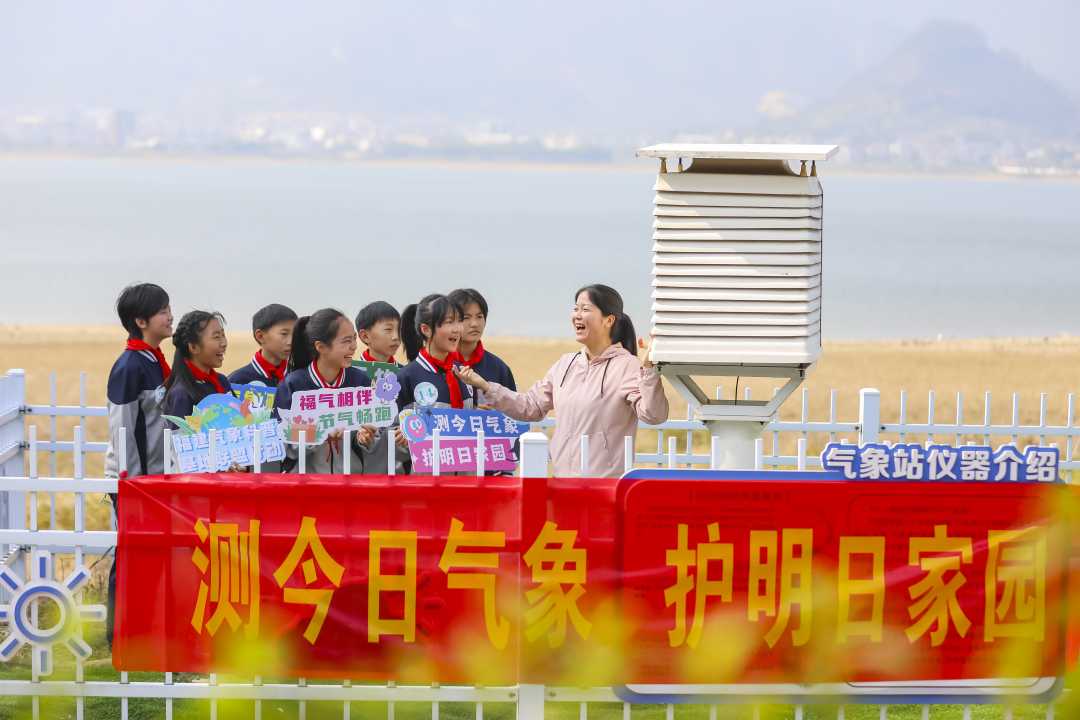 3月22日,福建省福清市石竹山风景名胜区内,来自瑞亭小学的小学生走进景区内的智能气象站点,在气象工作人员指导下观摩气象设备。