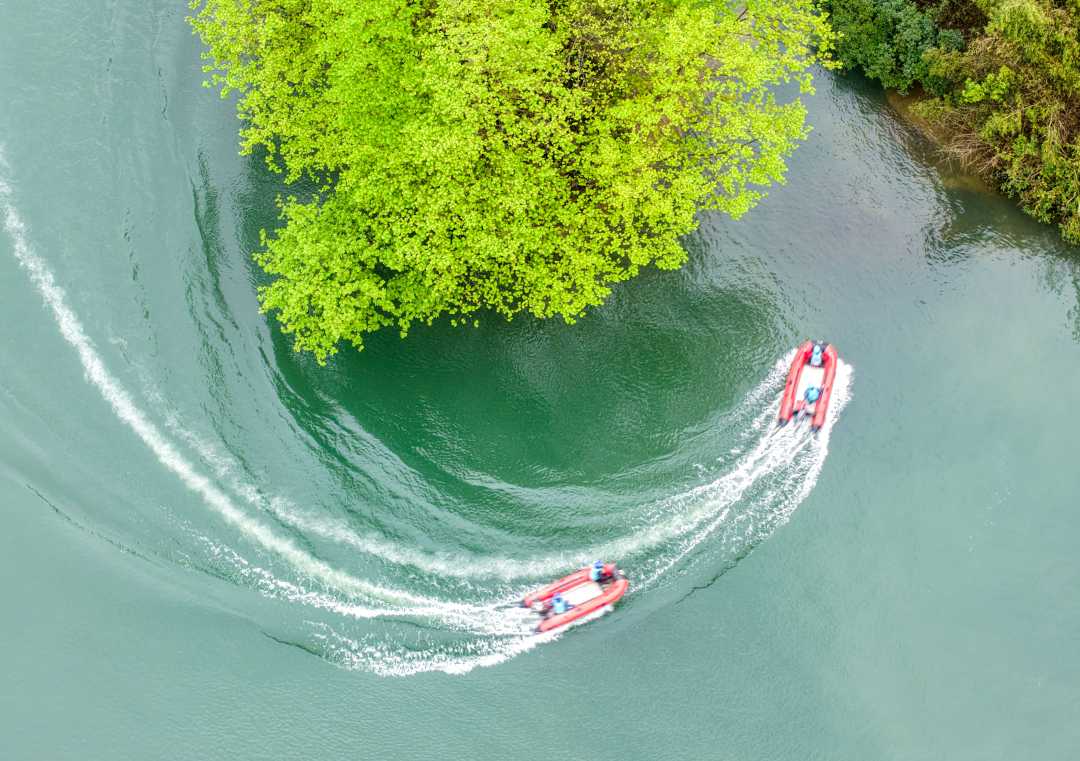 3月20日,湖南省永州市道县祥霖铺镇两河口村,民间河长和党员、志愿者驾驶快艇在河面上开展巡护作业。