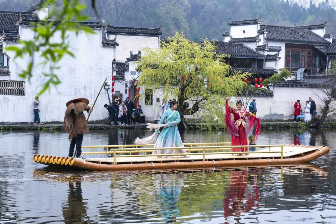 3月22日,演员在安徽省黟县宏村景区南湖的竹筏上给游客表演汉服秀。