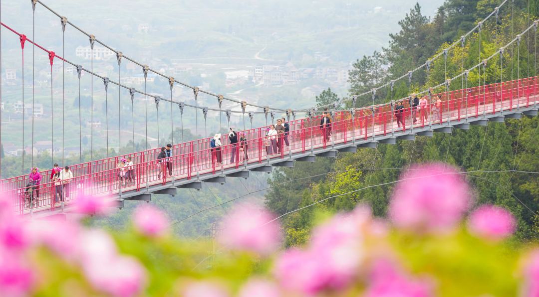 3月22日,重庆市垫江县恺之峰景区,山间盛开的牡丹花娇艳美丽,游客在玻璃廊桥上观景。