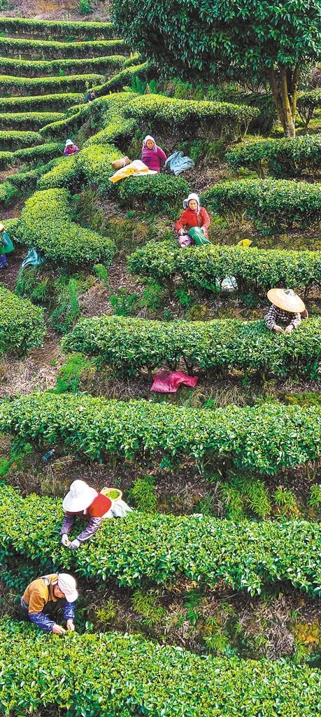 3月11日,湖南省怀化市通道侗族自治县菁芜洲镇地连村九层岭茶场,茶农在采摘春茶。