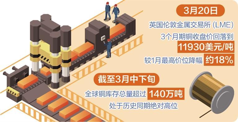市场分析人士认为,当前国际铜现货市场的实际情况推动了铜价短期回落。一是近期中东紧张局势升级,高能源价格加剧了市场对“供给型通胀”的担忧,进而抑制了制造业对铜的需求。二是截至3月中下旬,全球铜库存总量超过140万吨,处于历史同期绝对高位,特别是美国仓库的铜库存持续上升。三是高通胀预期下,美联储3月会议宣布维持利率不变,且保留加息可能,市场对年内美联储降息的预期明显降温,美元指数走强,使得以美元计价的铜对其他货币买家来说更加昂贵。
