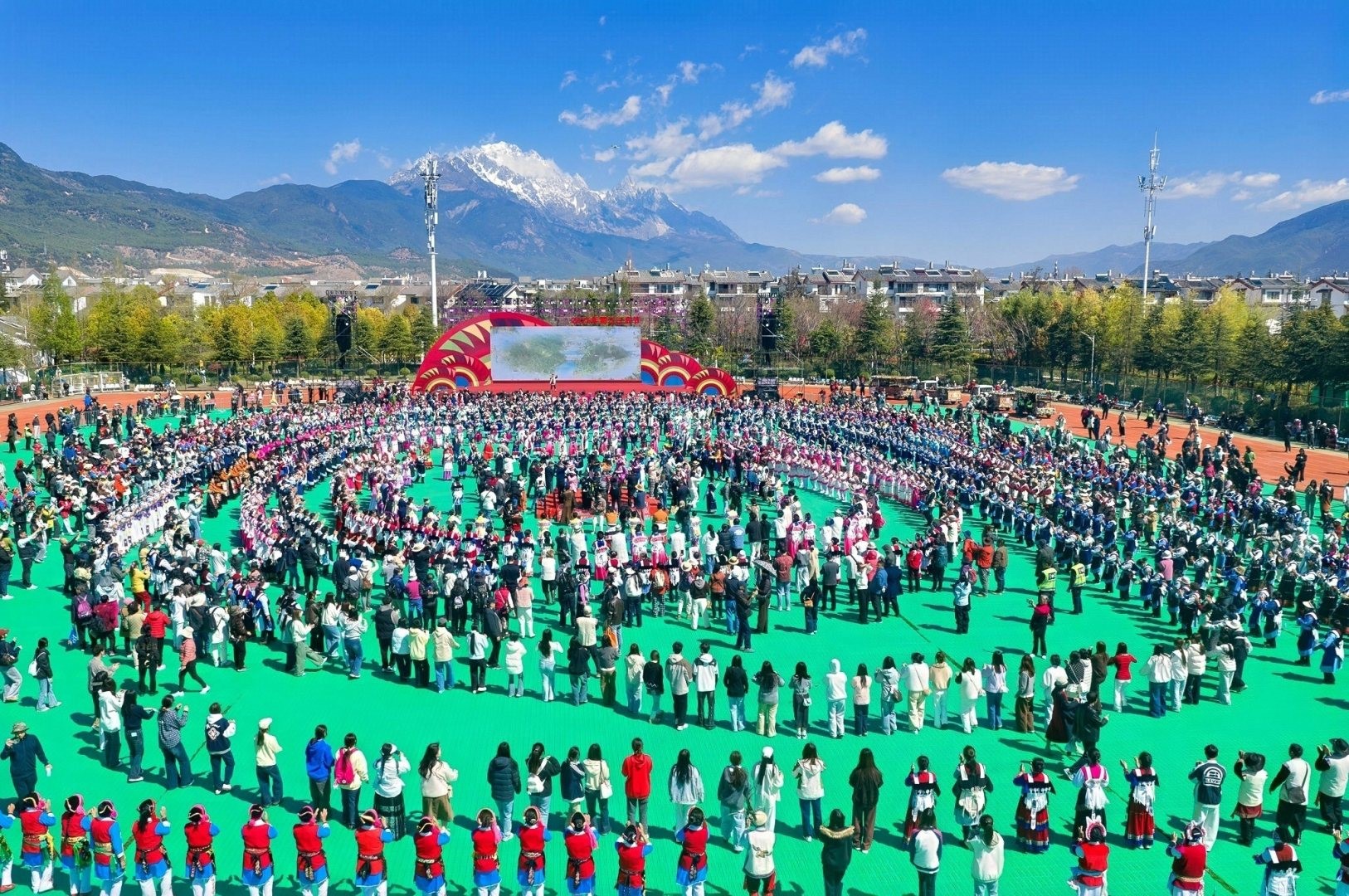 活动启动仪式在丽江市体育发展中心主舞台《吉祥鼓舞》激昂的鼓点中拉开序幕,歌伴舞《祖先》、纳西童谣《太阳月亮好》、舞蹈《幸福家园》等依次上演,生动呈现了纳西族文化的深厚底蕴与时代活力。万人打跳活动中,《纳西三部曲》《丽江欢迎您》《摩梭甲搓》《团结花开丽江美》等乐曲接连奏响,各民族群众和游客手拉手、围成圈,在欢快的舞步中共同庆祝这一民族盛典。