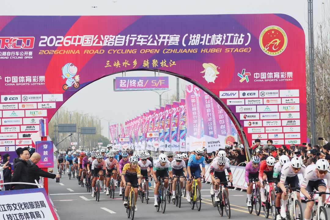 3月28日,2026中国公路自行车公开赛(湖北枝江站)在湖北省枝江市滨江公园鸣枪开赛。