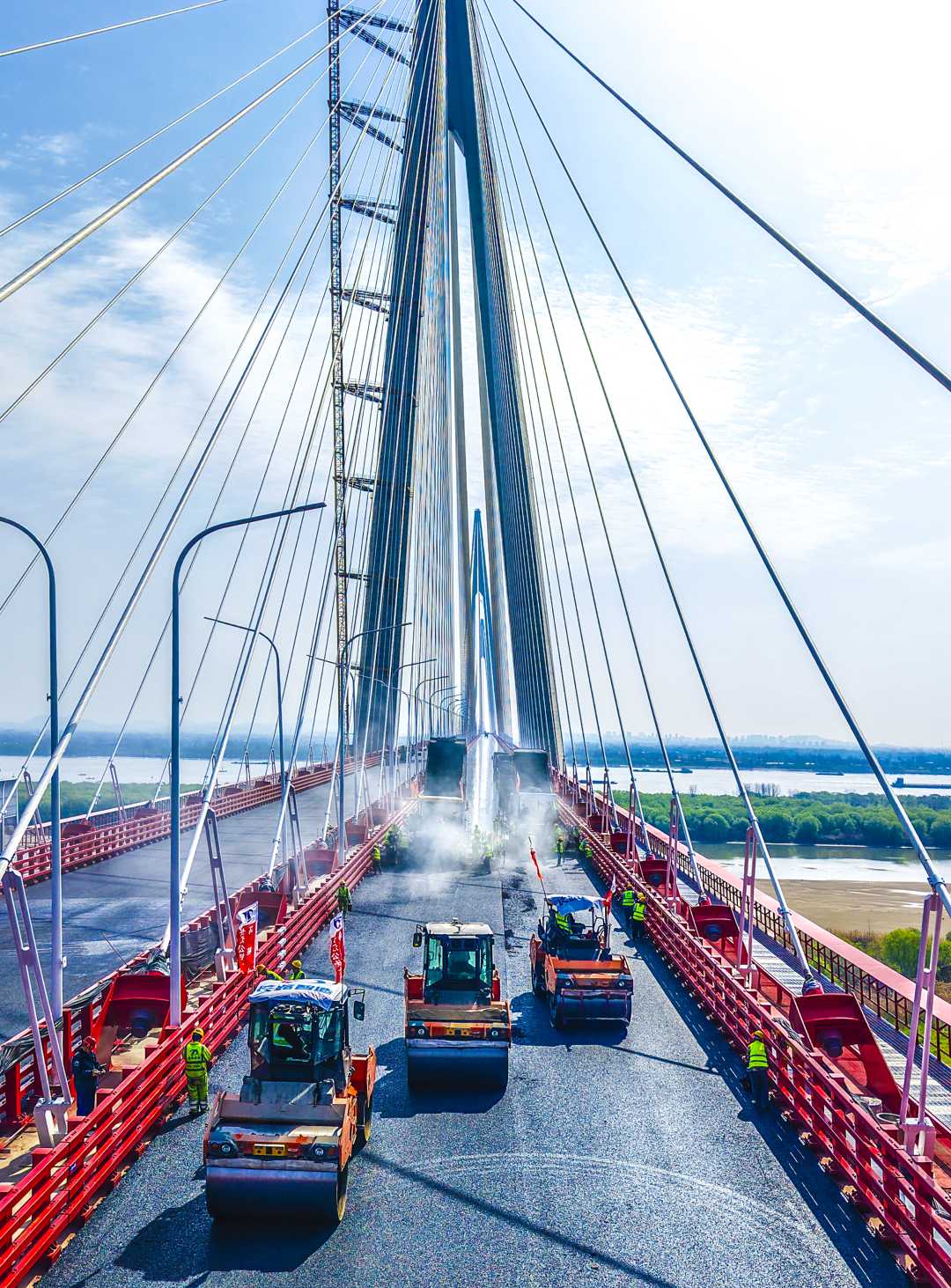 3月28日,安徽马鞍山长江公铁大桥,工人在进行钢桥面沥青摊铺作业。