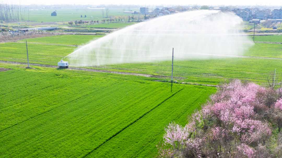 3月27日,河南省商丘市睢县,智能灌溉机器人在进行水肥一体化喷灌作业。