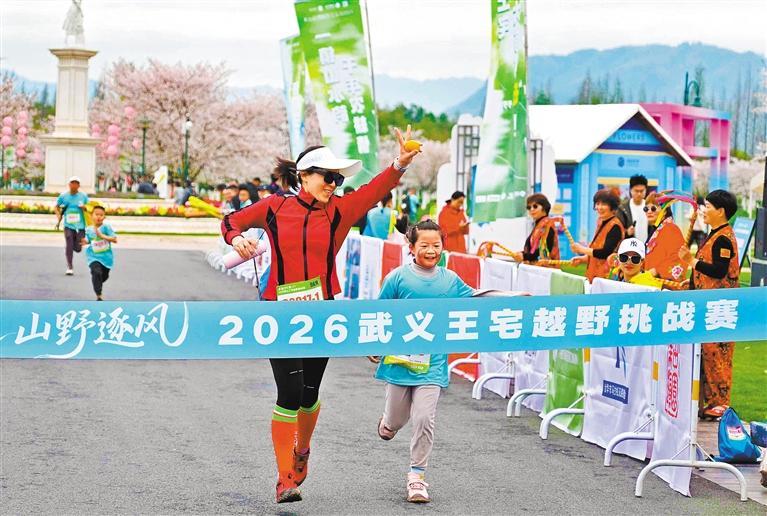 3月29日,2026武义王宅越野挑战赛在浙江省金华市武义县花田美地鸣枪开赛,参加亲子组的选手完赛冲线。张建成摄(中经视觉)